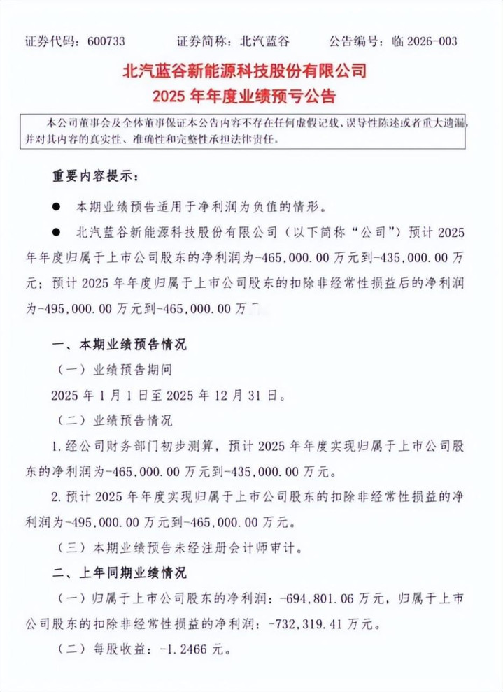 销量狂飙,亏损依旧2025年,北汽蓝谷(北汽新能源的上市公司)的销量曲线大幅上扬,全年卖出20.96万辆车,同比暴增84.06%,远超行业平均增速。增长主要由双品牌驱动: 极狐品牌销量突破16万辆,几乎翻倍增长,成为销量基石。享界品牌作为与华为合作的高端线,全年销量3.58万辆,其旗舰车型享界S9在12月首次实现单月销量破万。然而,漂亮的销量数字背后,财务上仍在“失血”。公司预计2025年归母净利润亏损43.5亿至46.5亿元,这已是连续第六年亏损,累计亏损额将超过338亿元。不过,亏损额相比2024年已收窄超三成,且第三季度毛利率历史性地转正至1.8%,释放出边际改善的信号。